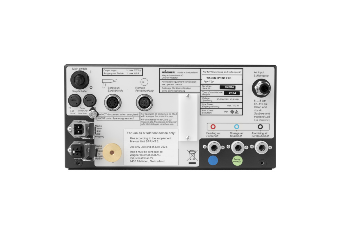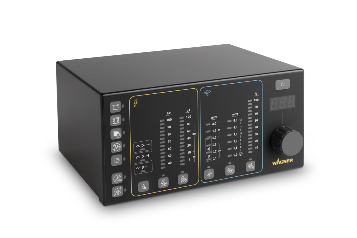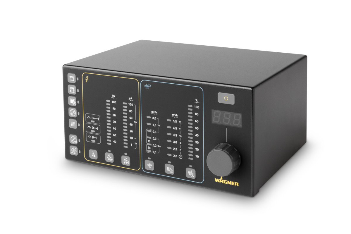 Das WACON Sprint 2 XE dient der manuellen Ansteuerung von Hand- sowie Automatikpistolen. Mittels einer weiteren Spannungsversorgung kann ein Rüttelmotor angeschlossen werden, welcher durch den Pistolentrigger gestartet wird. Hochpräzise Luftmengen- und Hochspannungsregler ermöglichen reproduzierbare Beschichtungsergebnisse.