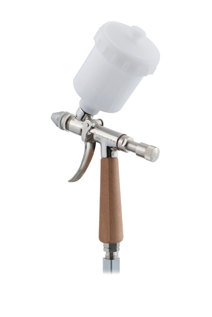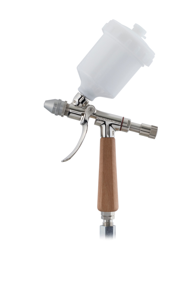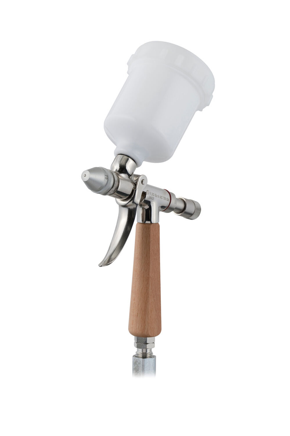 Die Spritzpistole mit ihrem einzigartig schlanken Holzgriff bietet eine angenehme Haptik und ist sowohl für Rechts- als auch für Linkshänder geeignet.